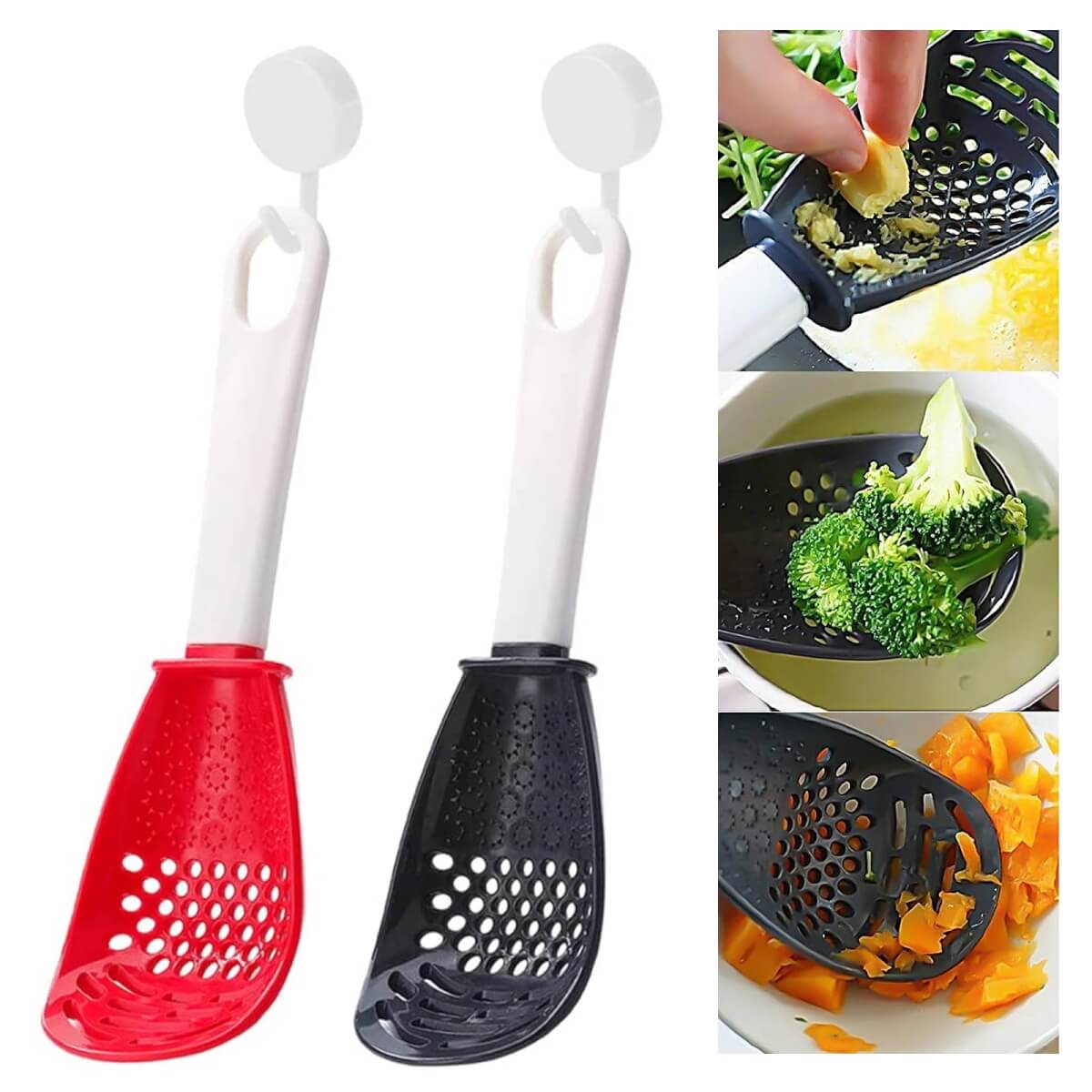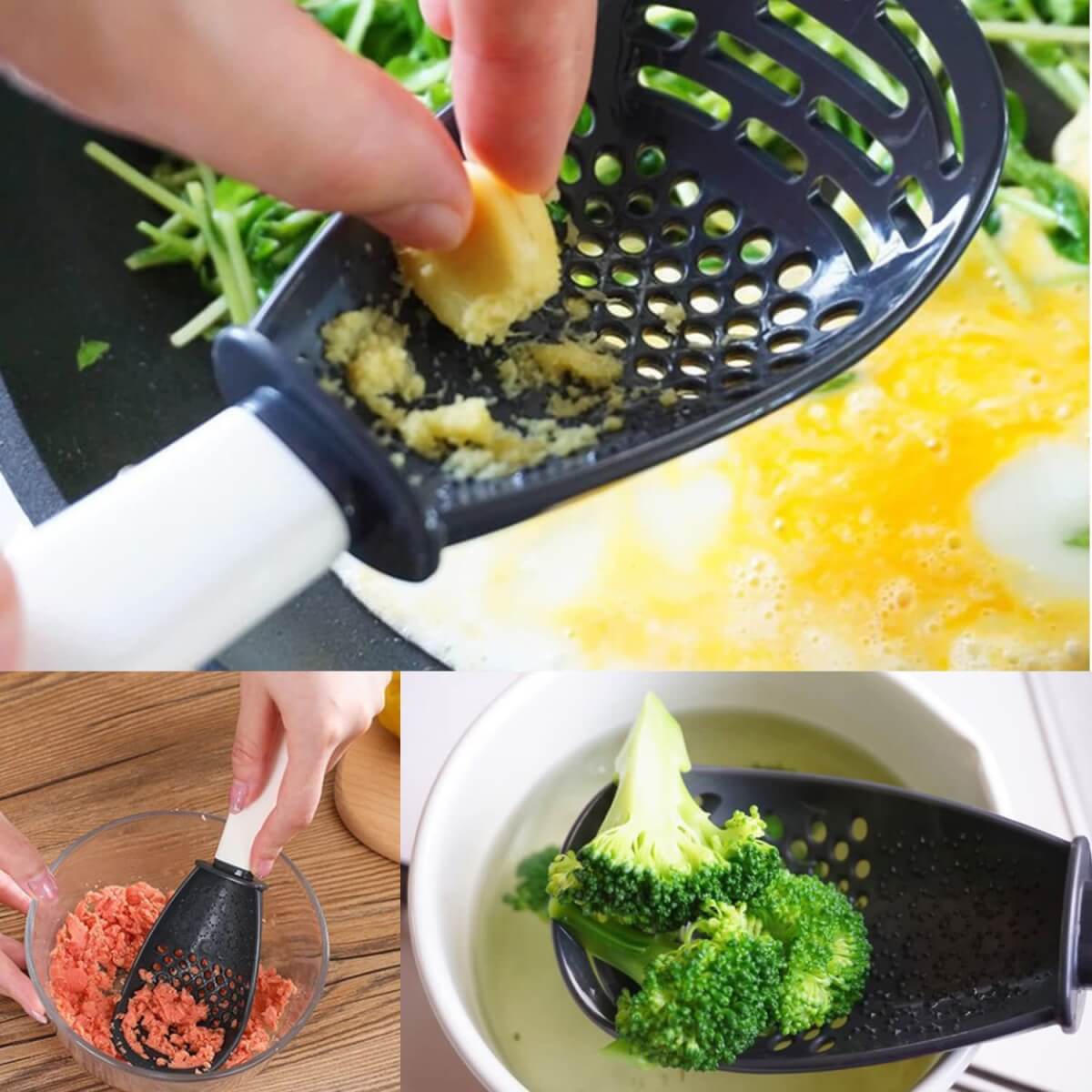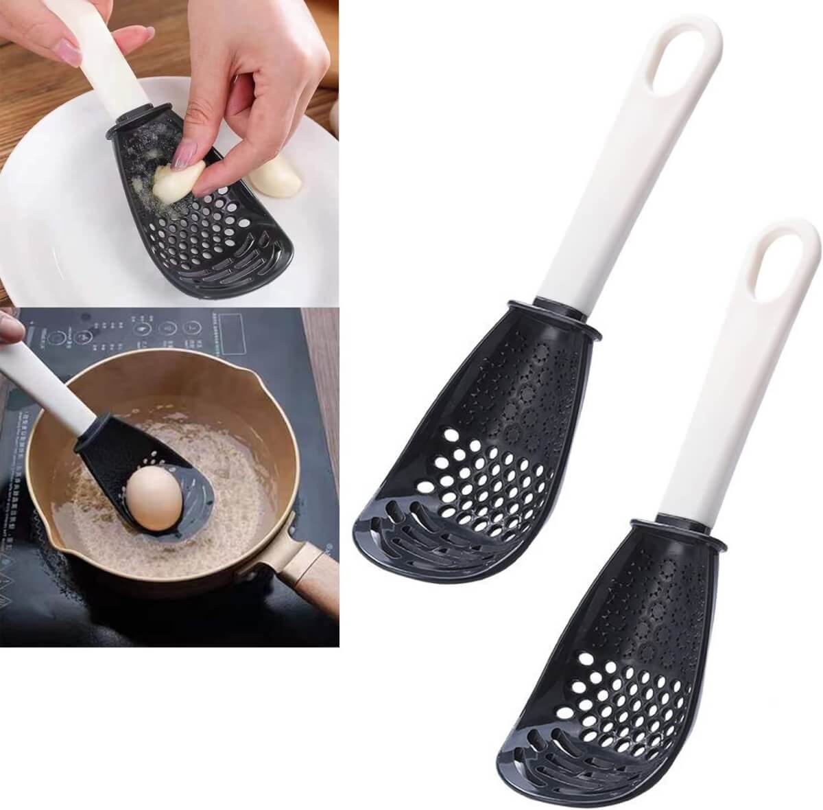 - Daugiafunkcinis virtuvės šaukštas gali būti naudojamas česnakams smulkinti, nusausinti, trinti ir tarkuoti maisto produktus.