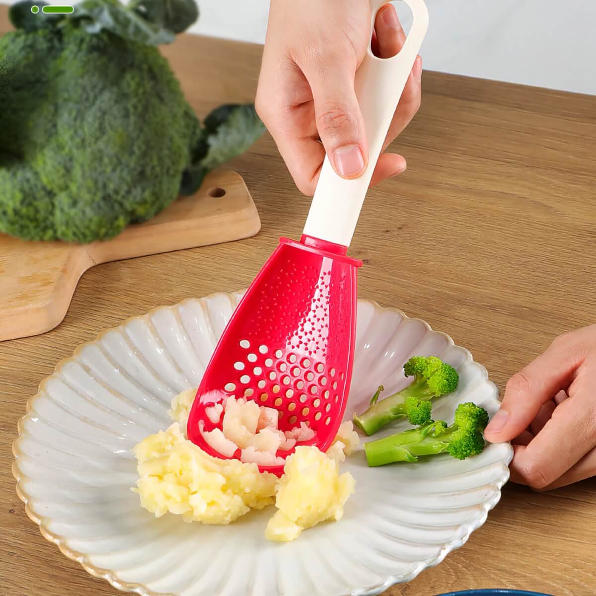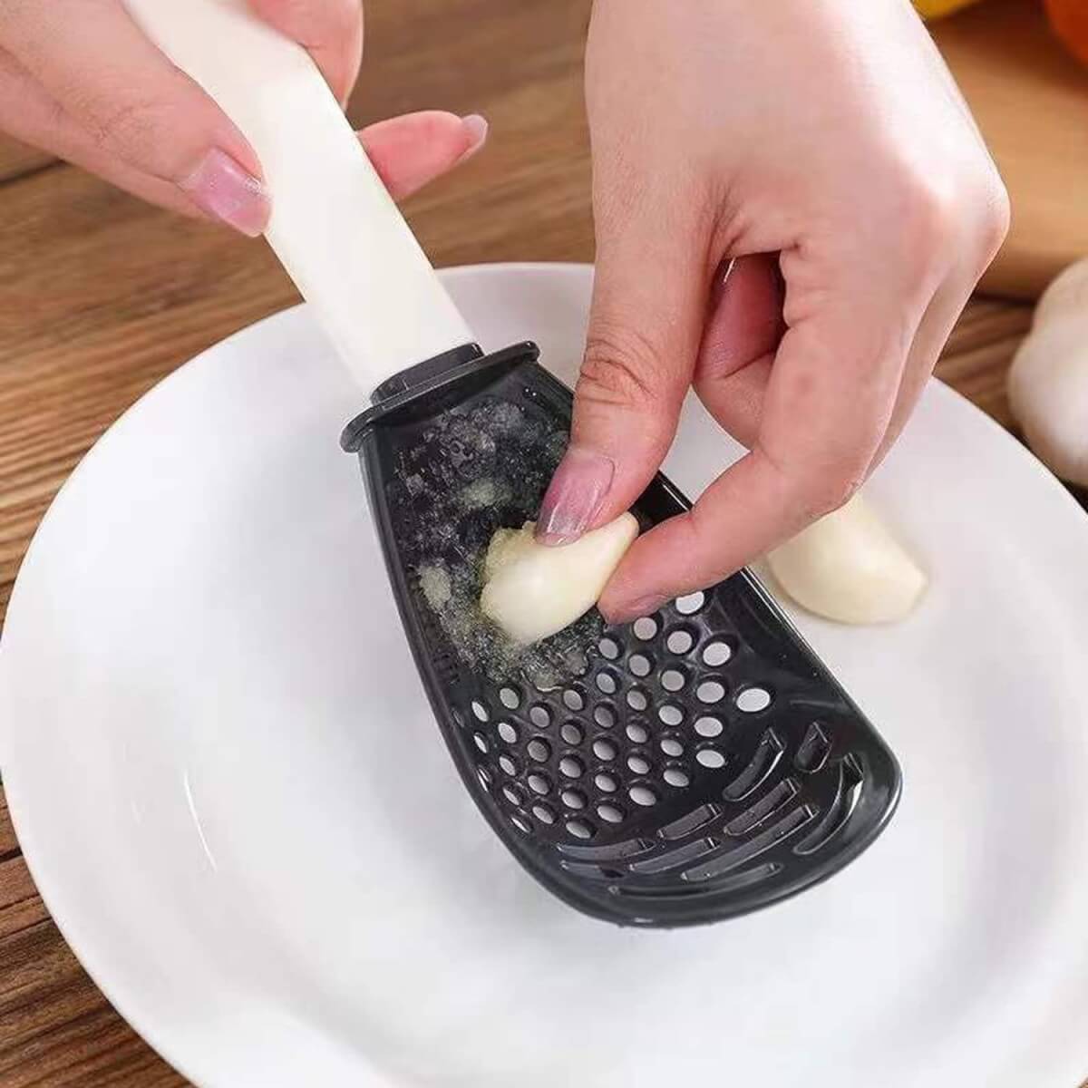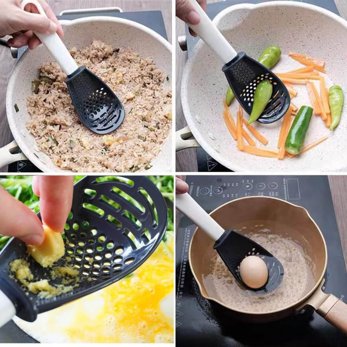 - Daugiafunkcinis virtuvės šaukštas gali būti naudojamas česnakams smulkinti, nusausinti, trinti ir tarkuoti maisto produktus.