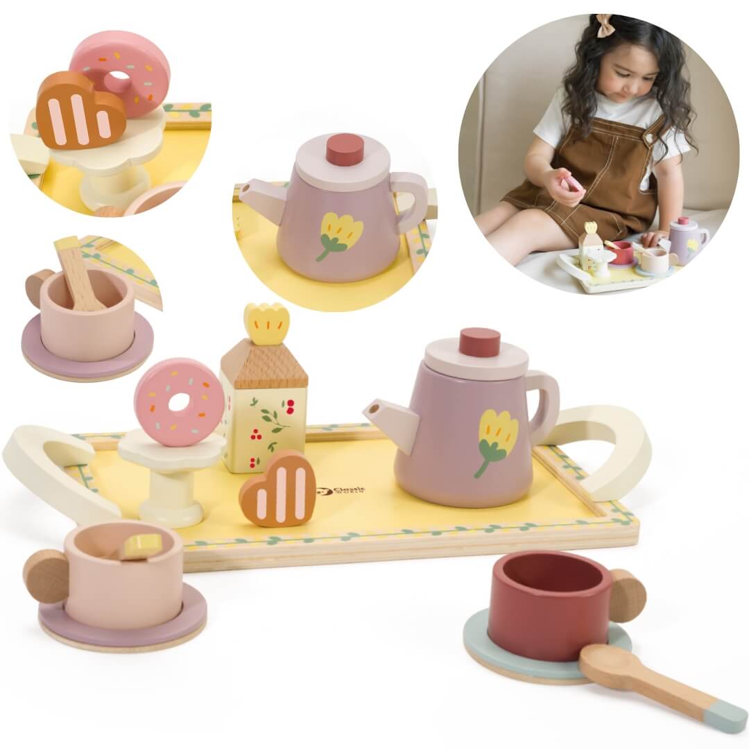 Šis rinkinys įkvėps vaikus kurti jaukius arbatos vakarėlius, priimti svečius ir vaišinti šeimą bei draugus. Žaismingi aksesuarai – arbatinukas, puodeliai, šaukšteliai ir desertai – skatina vaizduotę, kūrybiškumą ir socialinius įgūdžius, moko gerų manierų ir dalijimosi. Glotniai nušlifuota, aukštos kokybės mediena ir prislopintos pastelinės spalvos su gėlių dekoru suteikia žaislui estetikos ir saugumo.