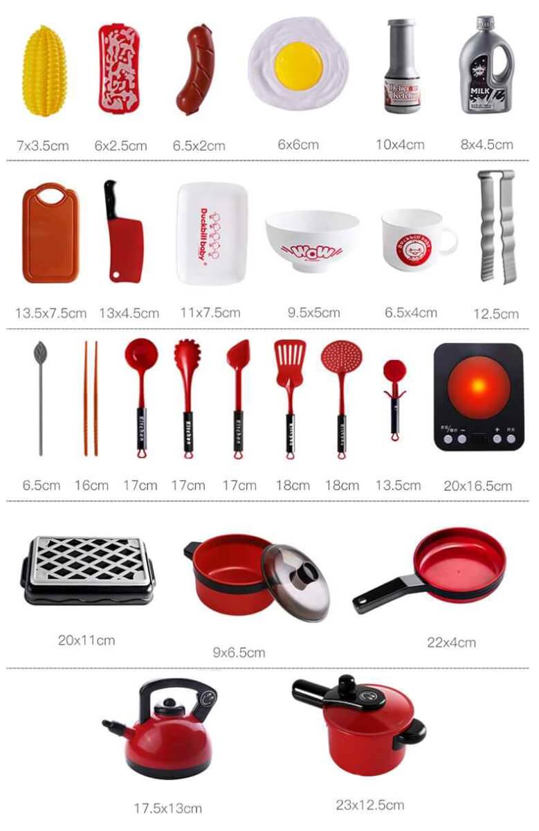 • Maisto maketai ir padažai: pienas, kečupas, kiaušinis, 2 kukurūzai, 2 mėsos gabaliukai, 2 dešrelės, vištienos gabalėlis ant pagaliuko, 3 pagaliukai su lapeliu