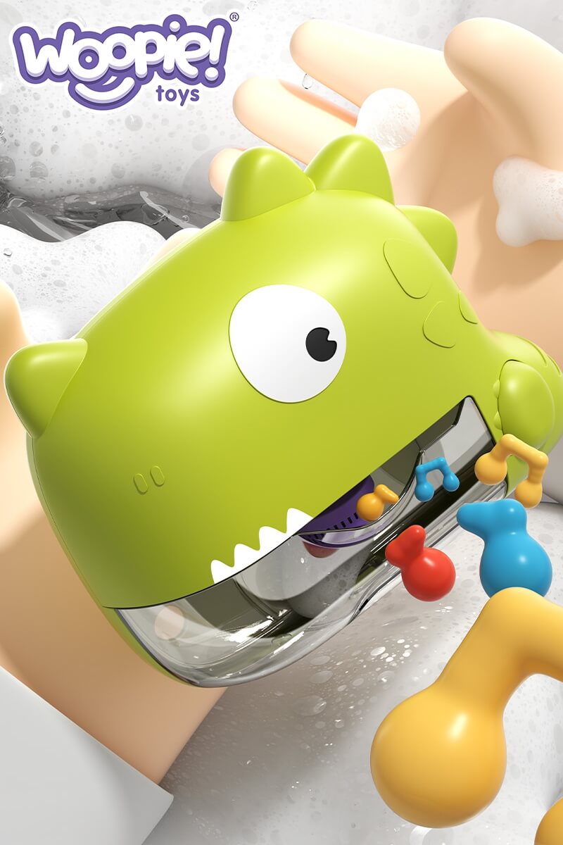 WOOPIE dinozauras – idealus vonios žaislas vaikams nuo 3 metų, kuris paverčia kasdienes maudynes smagia pramoga su burbulais ir muzika. Puiki dovana mažiesiems dinozaurų gerbėjams!