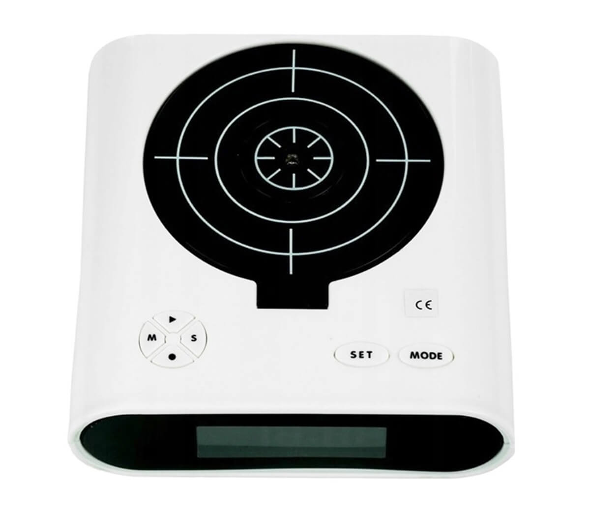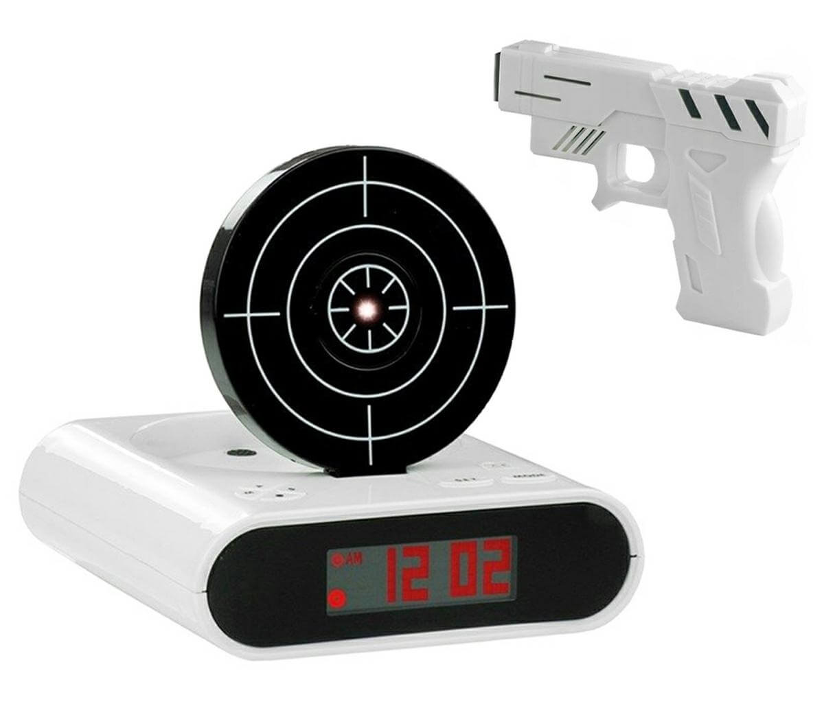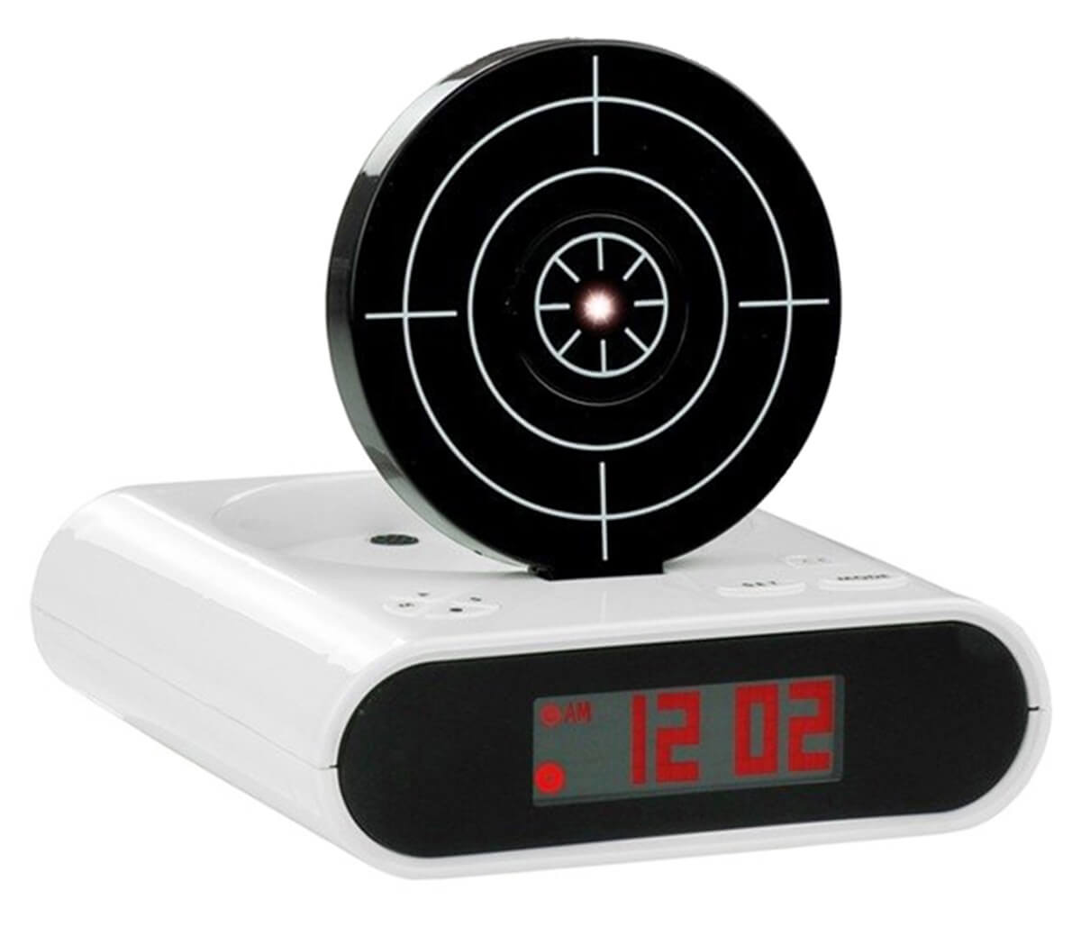 Efektyvus žadintuvas, skirtas tiems, kurie mėgsta paspausti „dar 5 minutės“. Kad signalas nutiltų, neužtenka paspausti mygtuko – žadintuvą išjungsite tik nusitaikę į taikinį ir „pataikę“ su pistoleto formos infraraudonųjų spindulių pulteliu. Smagi pramoga ryte ir puiki dovanos idėja miegaliams!