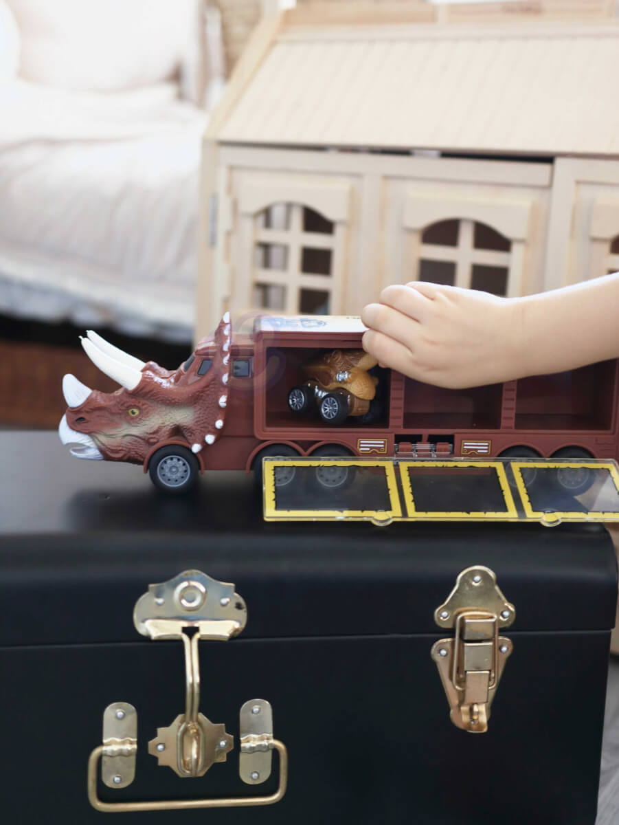 - Dinozauro formos didelis sunkvežimis su atidaroma erdve ir čiuožykla viduje